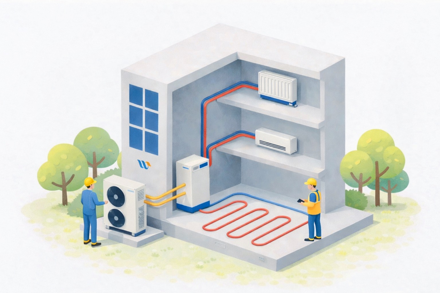 10kW-os levegő - víz hőszivattyú komplett gépészeti térrel bivalens módon
